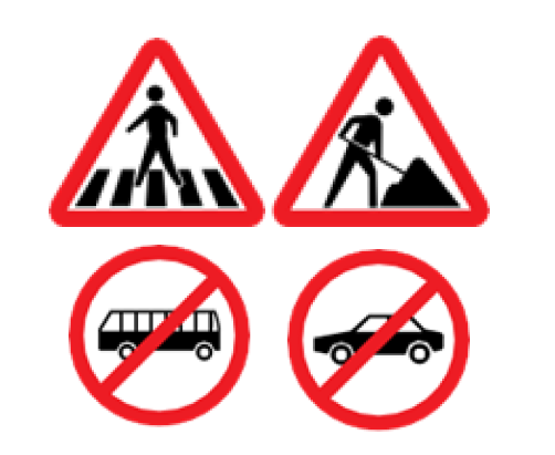 These signs are for the safety of oneself who is driving and advice the drivers to obey these signs. Warning signs or Cautionary signs give information to the driver about the impending road condition. They advice the driver to obey the rules. These signs are meant for the own safety of drivers. They call for extra vigilance from the part of drivers. The color convention used for this type of signs is that the legend will be black in color with a white background. The shape used is upward triangular or diamond shape with red boarders.