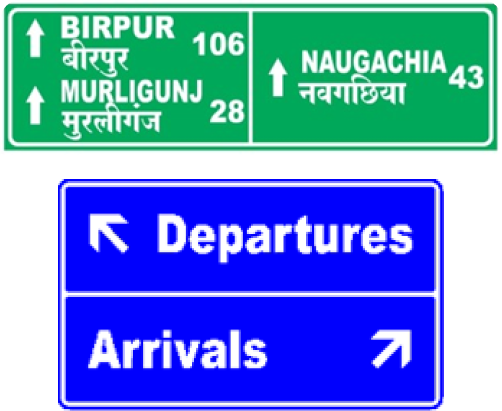 The signs illustrated in this section give information to the road user regarding their location or facilities available in the vicinity or about the Destination. The detailed dimensioned drawings for direction information signs with guidance for the design.
